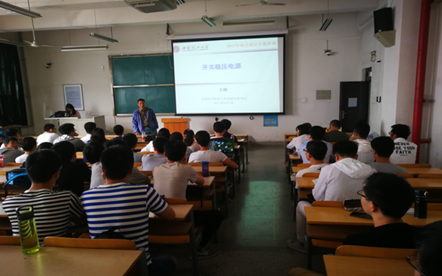然后由支娜老师开始讲解开关稳压电源方面的知识。支老师以往年国赛开关稳压电源的题目为例,根据比赛的特点和规则,为我们剖析了比赛的每一项要求,每一个电路功能模块和实现某一个功能不同的方法之间的优缺点。在讲完全部的模块之后老师告诉我们电源类比赛我们主要做的是对每一个模块外围电路上面的原件参数、控制算法做具体的参数调试和测试。最后,支老师为我们强调了比赛设计报告的重要性和我们在书写的时候需要注意的点。最后邢老师在总结了今天的培训后,强调比赛不是那“三天四夜”,需要我们提前准备好一些常用的基本模块方便后面的使用。