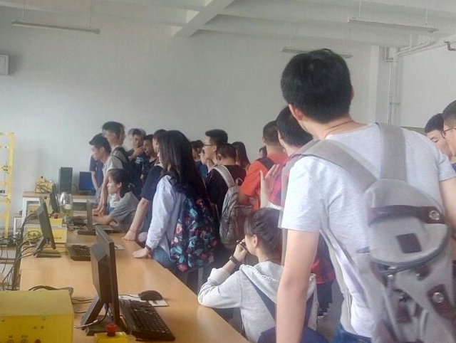 首先,带领大家参观的是非线性系统实验室,实验室负责老师和助手们给参观同学介绍了自动控制塔吊系统、太阳能逆变器、磁悬浮系统、倒立摆系统等实验室设备的用途和基本原理。随后同学们在飞控实验室看到了基于Quanser控制系统的四轴飞行器并且在实验室安装的24个摄像头跟能实时跟踪监测飞行器的位置。接着在图像处理识别与跟踪实验室学长学姐给我们演示了移动机器人的自主导航和操作机器人视觉伺服,介绍了这些设备的用途和商业前景。最后在罗克韦尔自动化技术综合实验室介绍了饮料瓶罐装系统,该系统是等同于实际的饮料瓶罐装系统的工业生产线,通过对该系统的学习与研究让我同学们有机会去亲自体验工业自动化控制设备以及晶体生长设备。