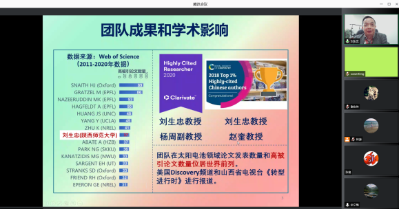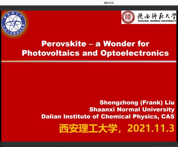2021年11月3日下午,应公司太阳集团tyc151邀请,陕西师范大学新能源高等技术研究院经理刘生忠教授为太阳集团tyc151师生作了题为《Perovskite – a Wonder for Photovoltaics and Optoelectronics》的学术讲座,并与参会师生进行了在线交流。