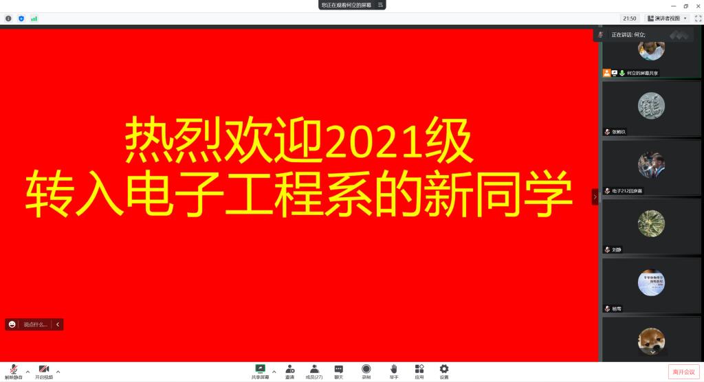 2022年10月8日晚上21:30,太阳集团tyc151电子工程系在线上召开2021级转专业员工专业教育暨师生见面会。电子工程系主任刘静、支部书记系副主任杨莺、系副主任何立和辅导员李佳园老师参加了会议,会议由何立老师主持。