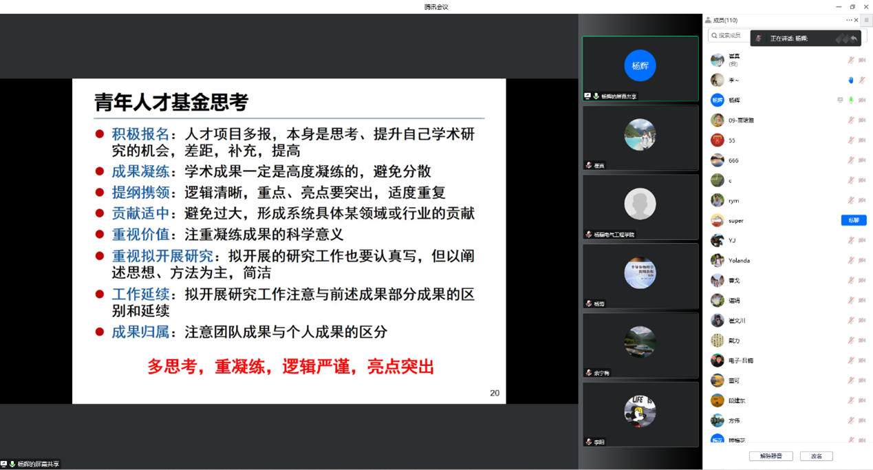 杨辉教授结合自身申报国家基金的经验,首先对国家自然科学基金准备的时间、领域、定位、问题、创新、价值及必要性做了详解,然后从项目申请书的题目、摘要、立项依据、研究内容、研究目标、关键科学问题、研究方案及可行性分析、特色和创新之处、研究基础及项目经费与其他事项等方面给出了具体的撰写建议和注意细节,也总结了自己作为评审人在同行函评过程中的一些感想,以及需要规避的常见错误。杨教授希望大家在吃透申报指南的基础上对申请书进行反复凝练、修改打磨。最后,杨教授分享了自己申请国家优青的经验,鼓励大家积极申报人才类项目。