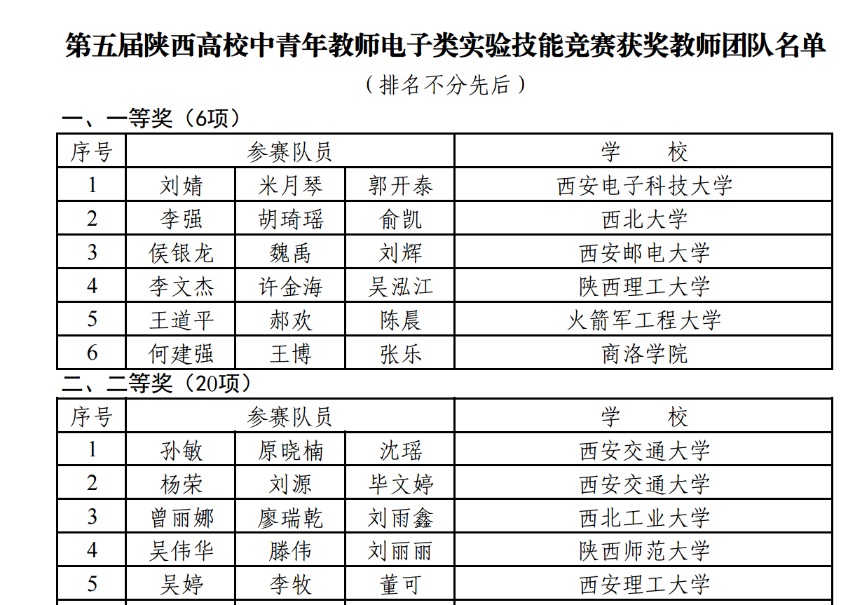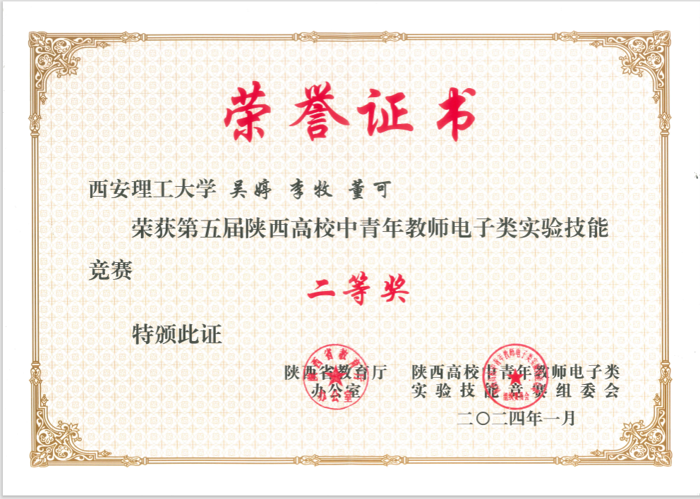 近日,陕西省教育厅、陕西高校中青年教师电子类实验技能竞赛组织委员会颁发了第五届陕西高校中青年教师电子类实验技能竞赛获奖证书,太阳集团tyc151教师吴婷、董可及工程训练中心李牧老师组成的参赛团队获二等奖。本次竞赛由陕西省教育厅主办,西安电子科技大学承办,于2023年12月19日-21日在西安电子科技大学举行,来自陕西省49所高校的108支团队、324名教师参赛,共评选出一等奖6项,二等奖20项,三等奖22项。