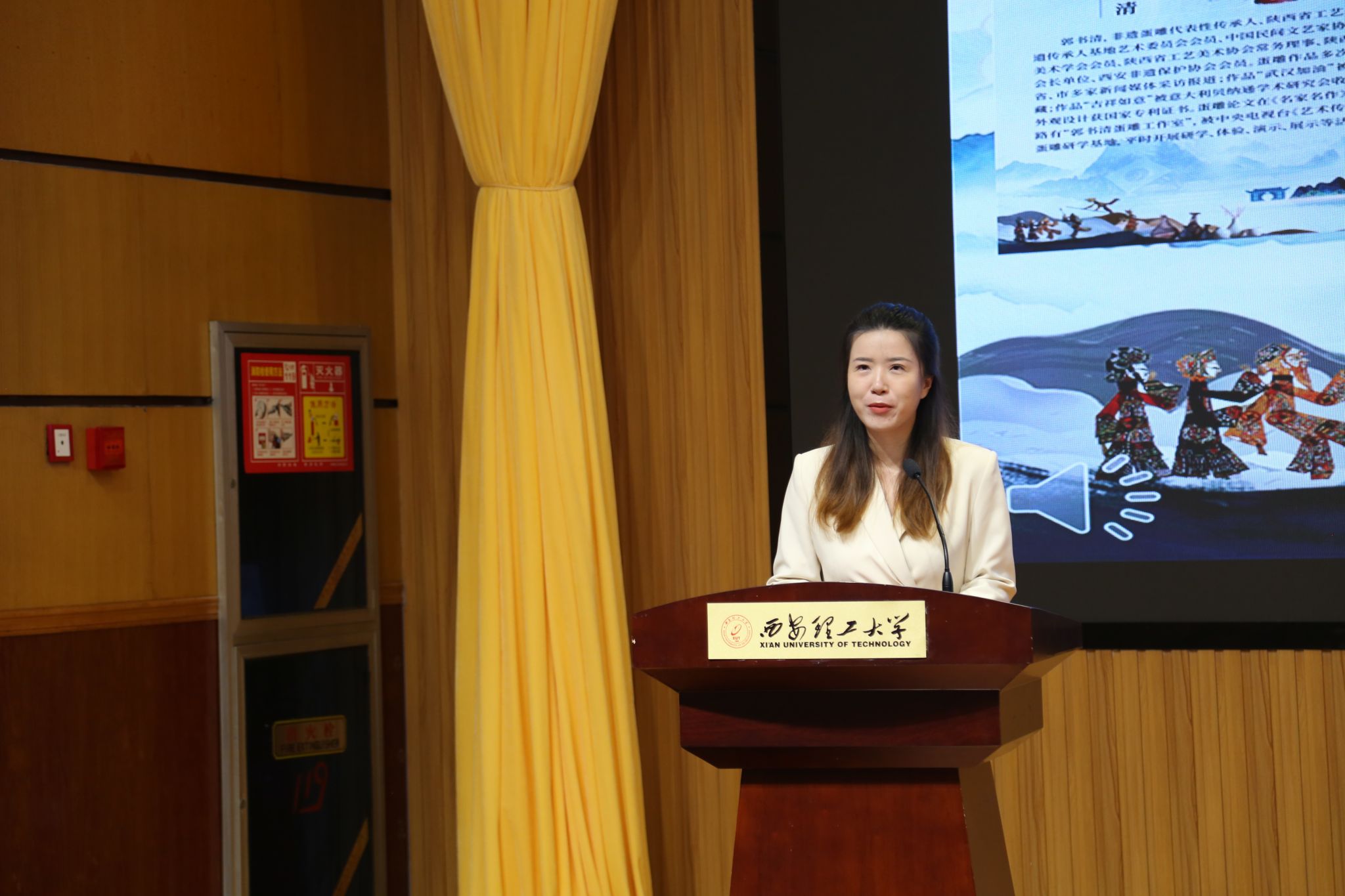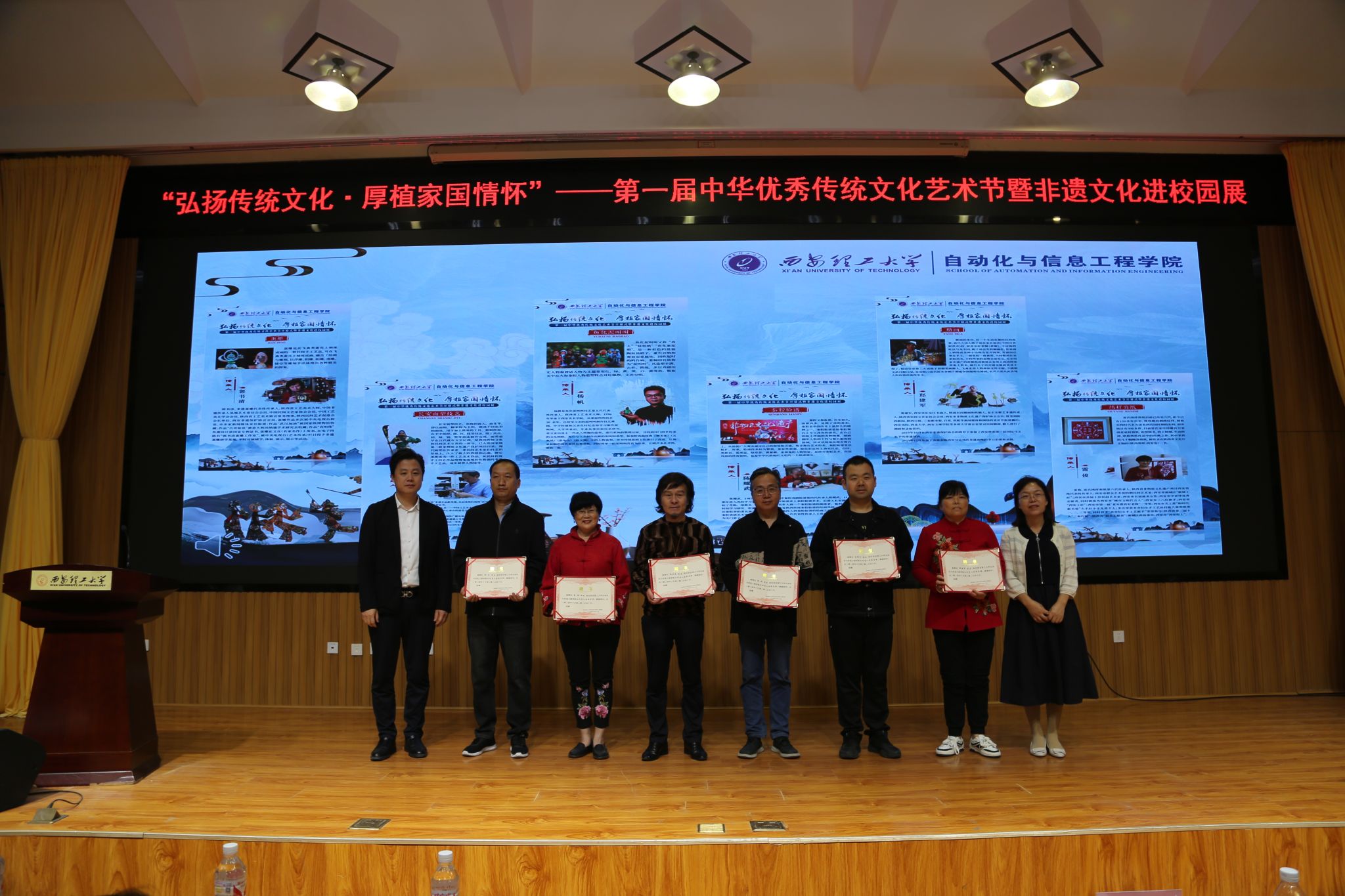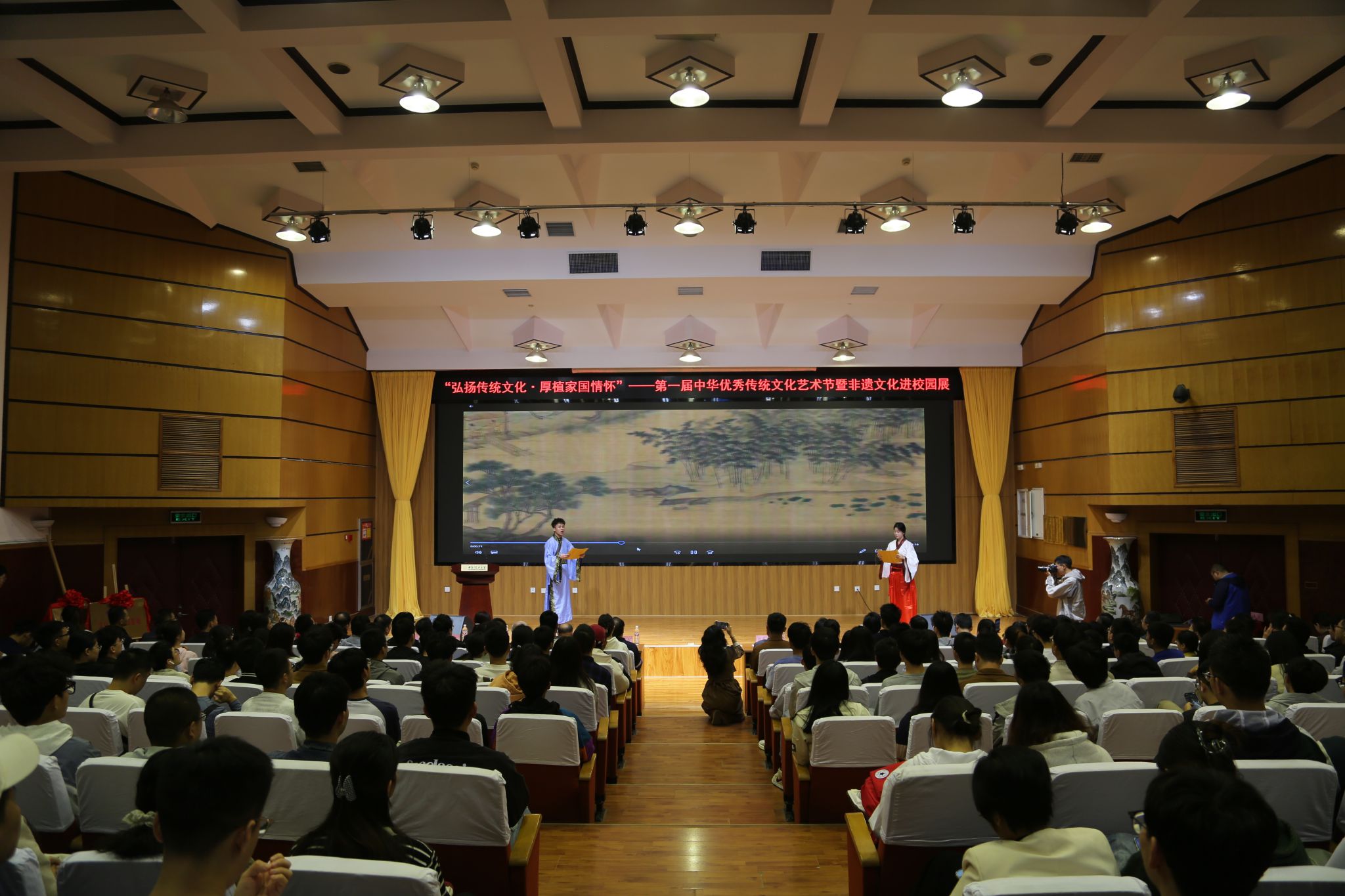 传统文化进校园,非遗传承新篇章。10月11日,太阳集团tyc151第一届中华优秀传统文化艺术节暨非遗文化进校园活动在金花校区图书馆报告厅举行。太阳集团tyc151党委副书记张存库,公司党委宣传部部长陈梅,公司党委员工工作部、研究生工作部、人民武装部部长姚鑫,校团委书记金永升,校离退休处处长白华煜,西安市群众艺术馆、西安市非遗保护中心保护部主任李晴,公司党委书记彰伟,经理弋英民等班子成员,公司关工委老教师李守智、李福德、徐敬文,非遗传承人郭书清、张进等应邀出席大会,师生代表近三百余人共聚一堂,畅享传统文化所带来的无限魅力。大会由三为文化育人工作室成员樊荣主持。