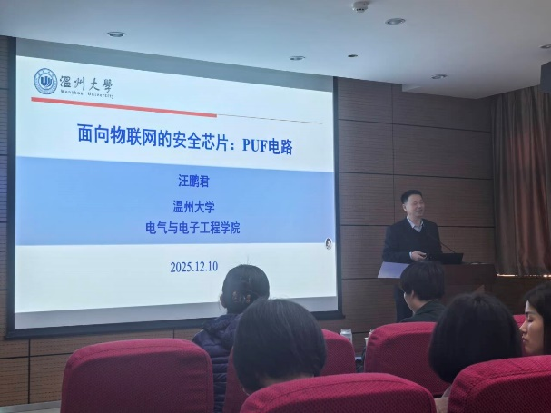 汪鹏君教授以《面向物联网安全芯片:PUF电路》为题,系统介绍了PUF电路的研究现状、发展趋势及其团队的关键研究成果,并展望了该技术在物联网安全领域的应用前景。报告内容立足前沿、观点深刻,有力拓展了在场师生的学术视野与研究思路。
