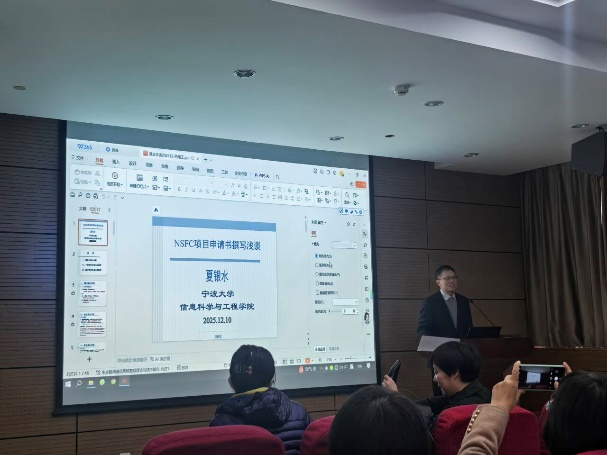 夏银水教授以《国家自然科学基金申报体会分享》为题,细致讲解了国家基金一般项目与重点项目申报书各部分的撰写要点,他结合具体案例,深入剖析了基金申请书各部分的核心要素与写作方法,为教师提供了具有实操性的申报指导。